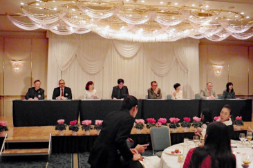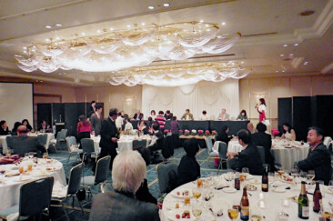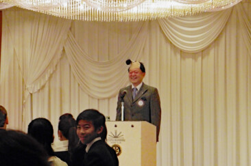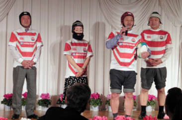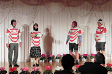 結びにブレイブブロッサムジャパンのジャージに身を包んだ現年度会長幹事、会長幹事エレクトがバトンならぬラグビーボールでパス交換、リーチマイケルにメイクアップされた坂根会長は当夜一番の拍手で迎えられました。